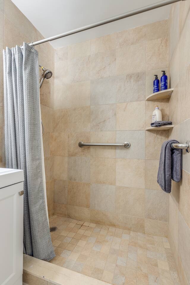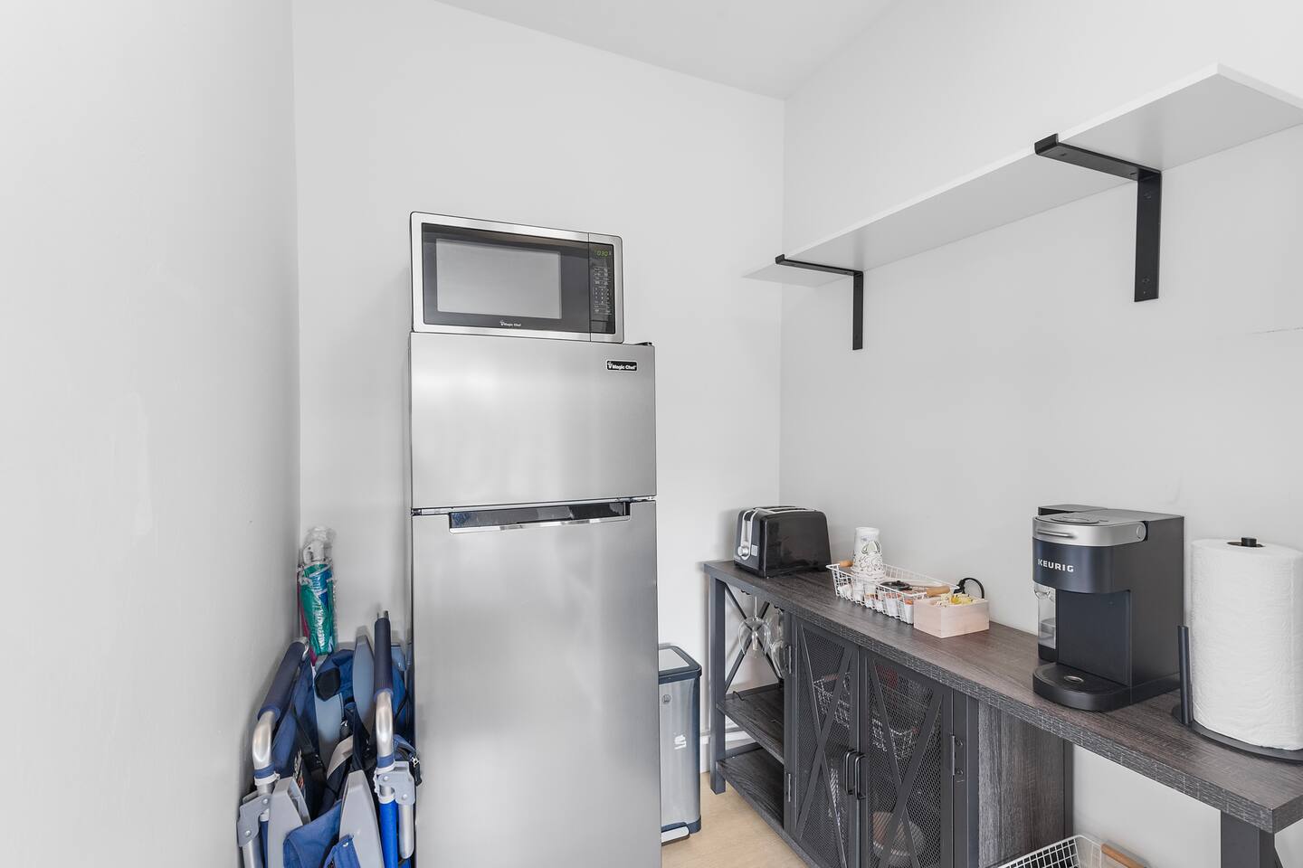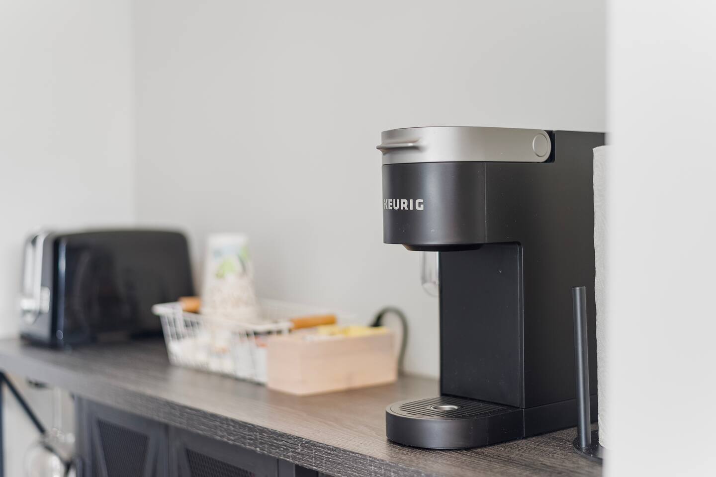 The single room efficiency is comfortable and stylish, featuring a large king size bed, en suite bathroom, and sitting area for 2. Large Flat Screen Smart HD TV and High Speed Internet. Kitchenette includes a fridge/freezer, microwave, coffee machine, coffee cups, and wine glasses. While it does not have a sink, we do include disposables for convenience. Outside of your private entry, you will find a secluded patio area with high top table, perfect for enjoying a morning coffee or glass of wine.