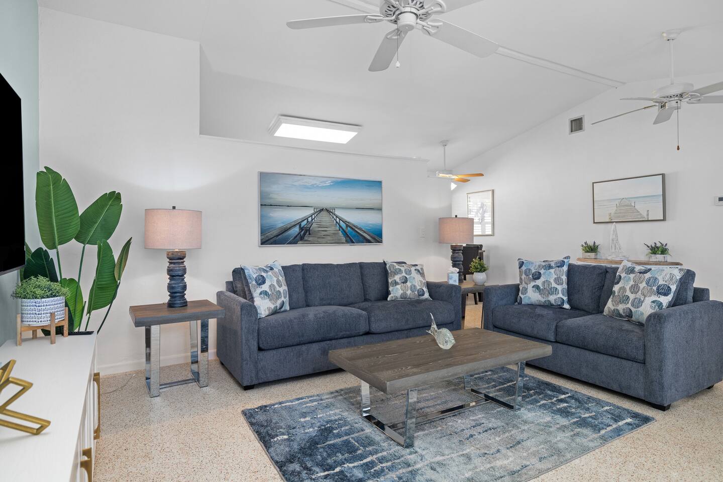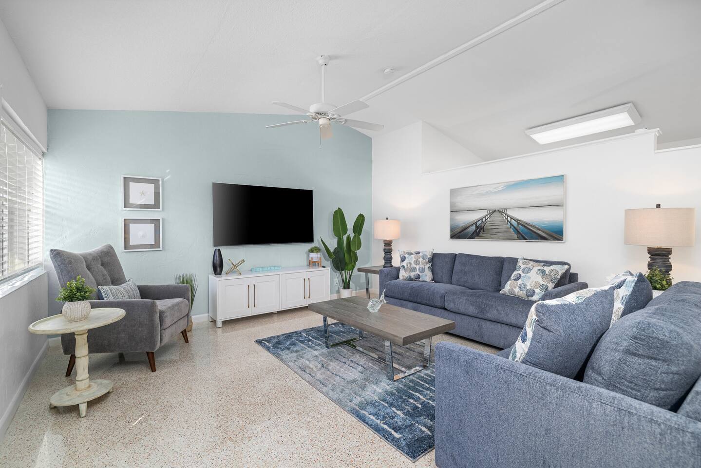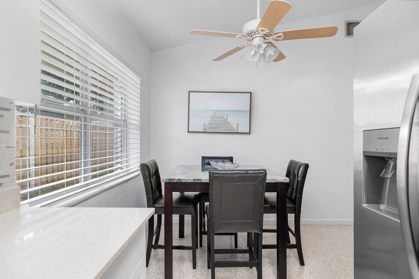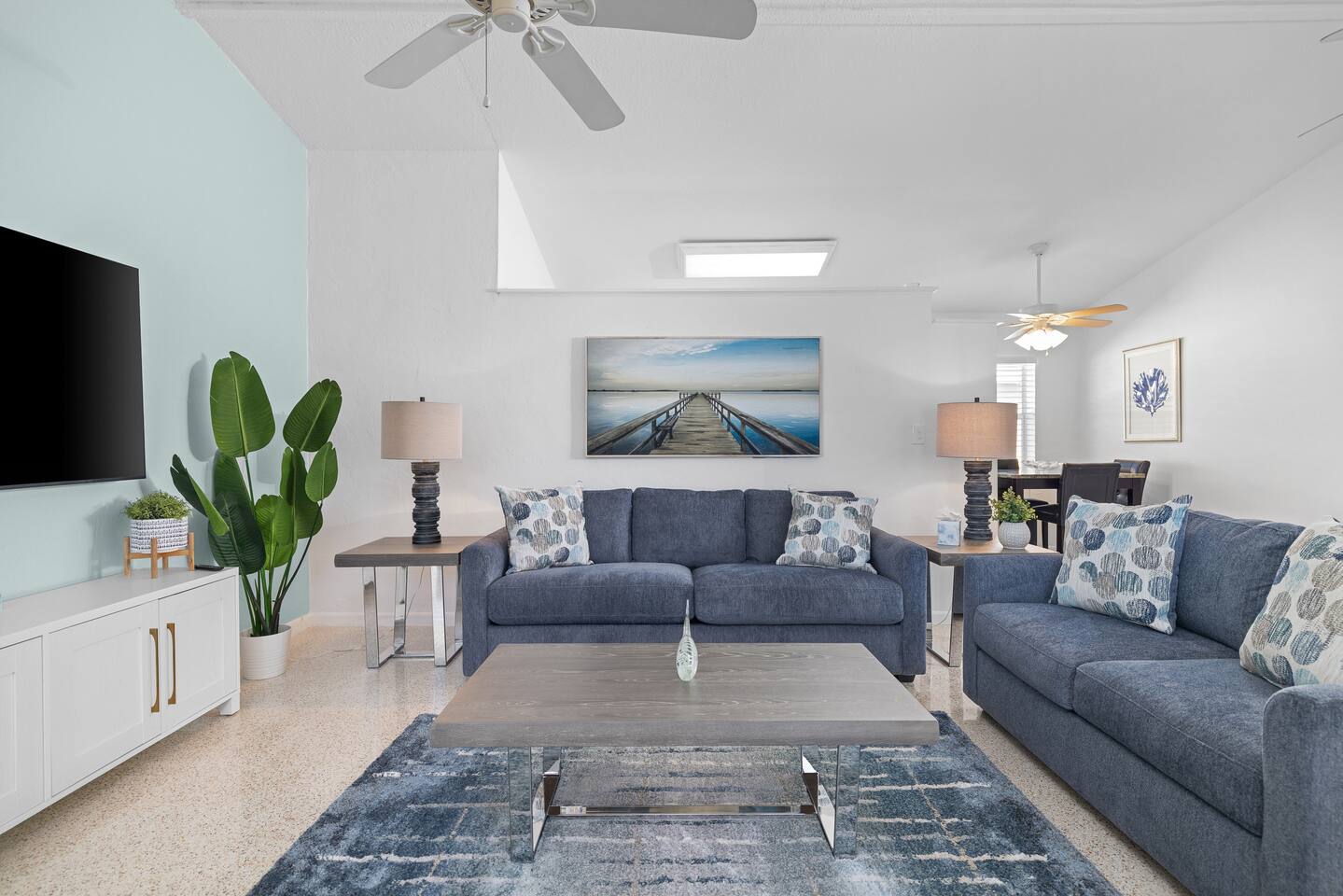 This spacious 2-bedroom, 2-bath duplex apartment features a shared pool situated between the two units. The unit is clean, updated, and includes a large living area with 70-inch smart TV, a fully equipped kitchen for preparing homemade meals, a dining area that seats four, and a private back patio. The bedrooms include a King and Queen bed, each with smart TVs and ample closet space. Conveniently located just 1.3 miles from the beach and within walking distance to Target, Publix, and the mall.