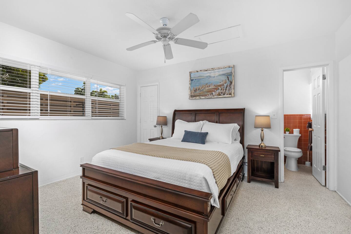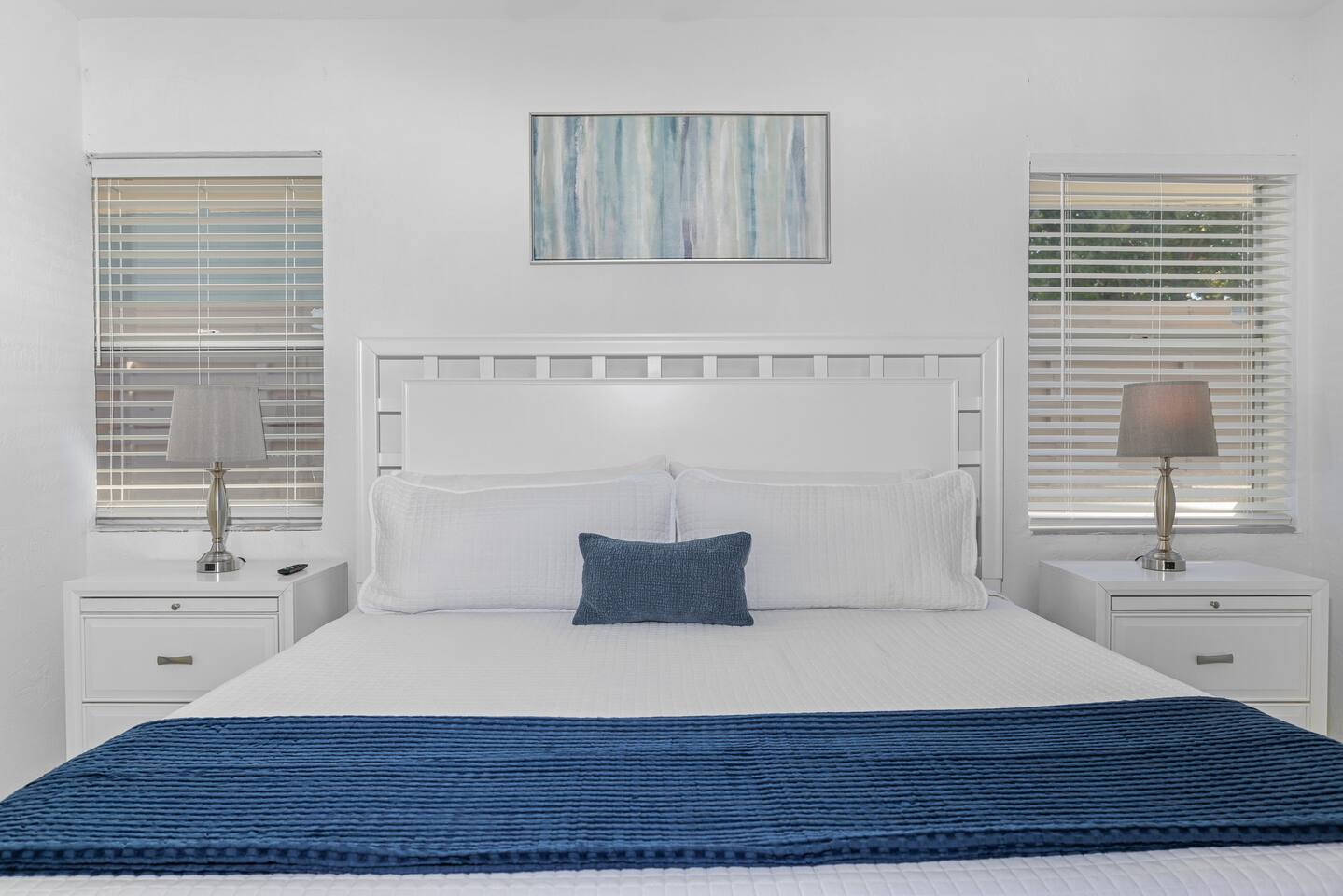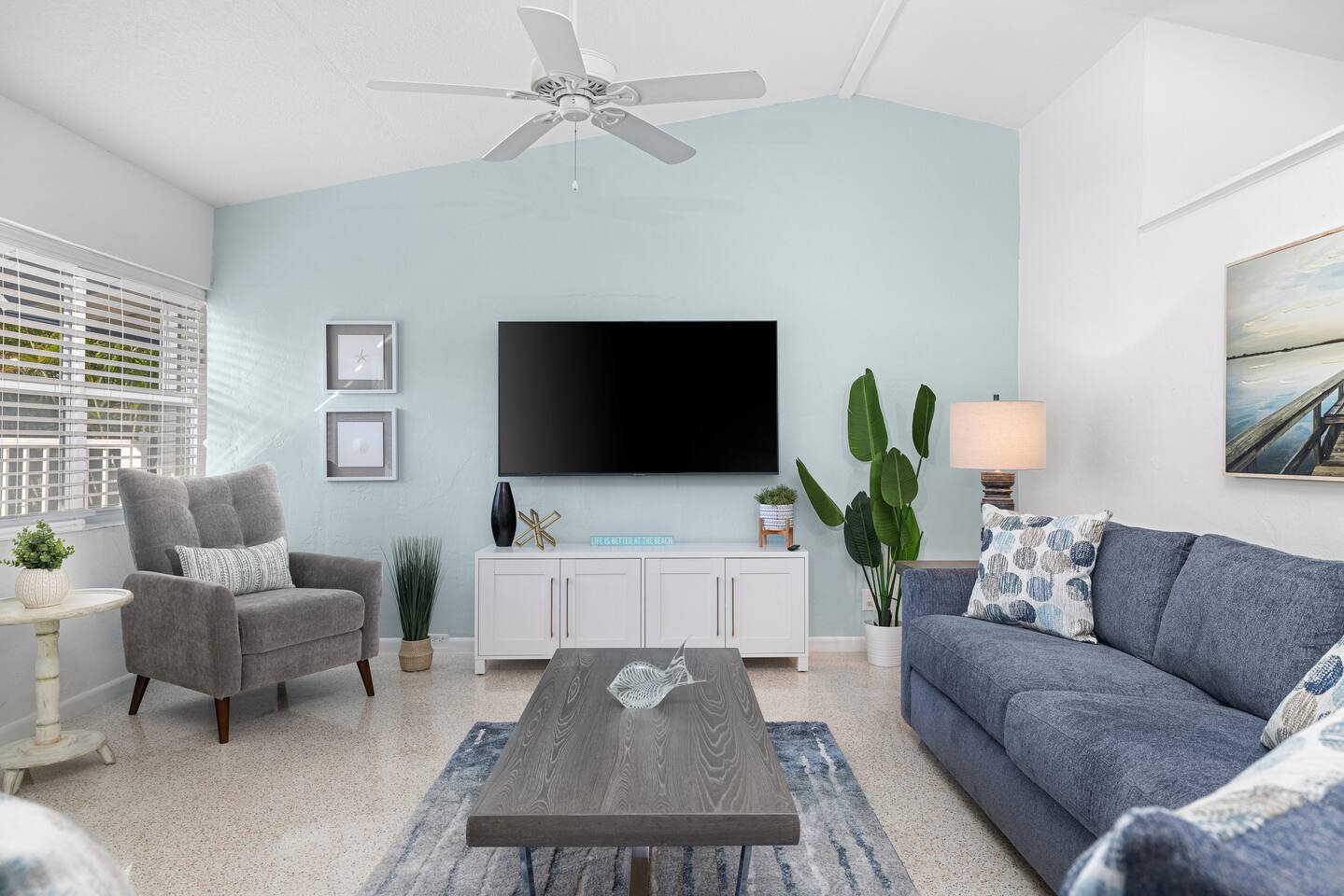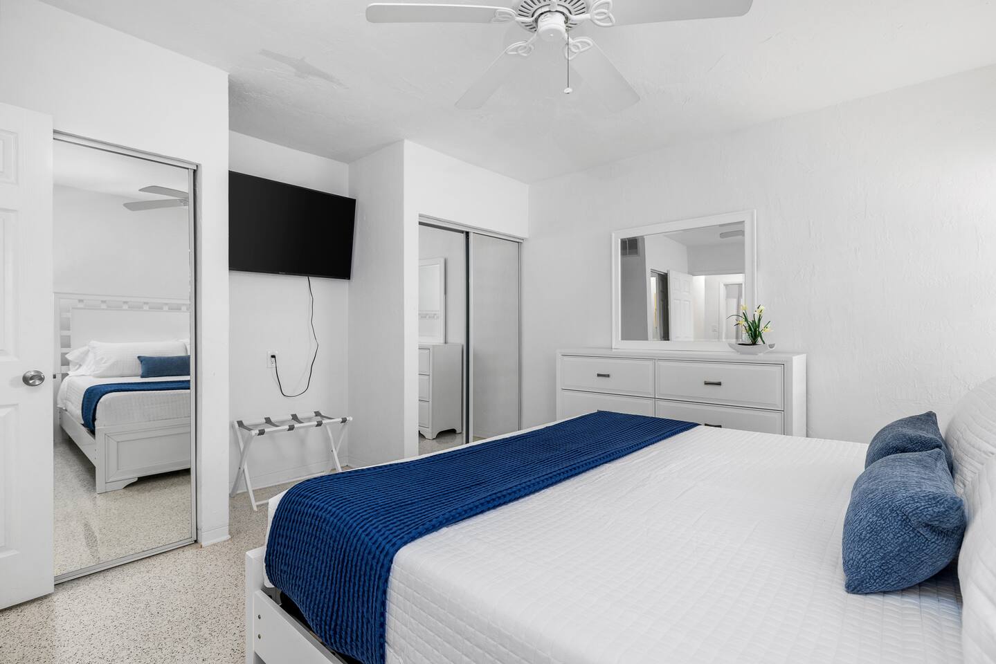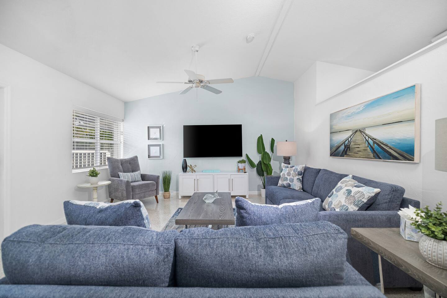 This spacious 2-bedroom, 2-bath duplex apartment features a shared pool situated between the two units. The unit is clean, updated, and includes a large living area with 70-inch smart TV, a fully equipped kitchen for preparing homemade meals, a dining area that seats four, and a private back patio. The bedrooms include a King and Queen bed, each with smart TVs and ample closet space. Conveniently located just 1.3 miles from the beach and within walking distance to Target, Publix, and the mall.