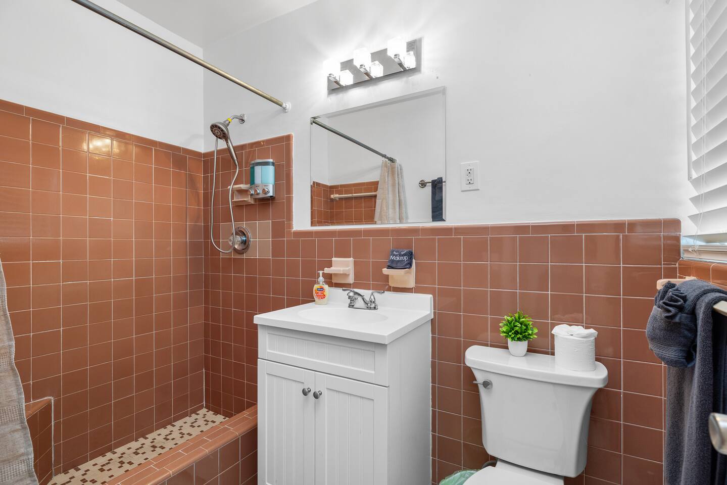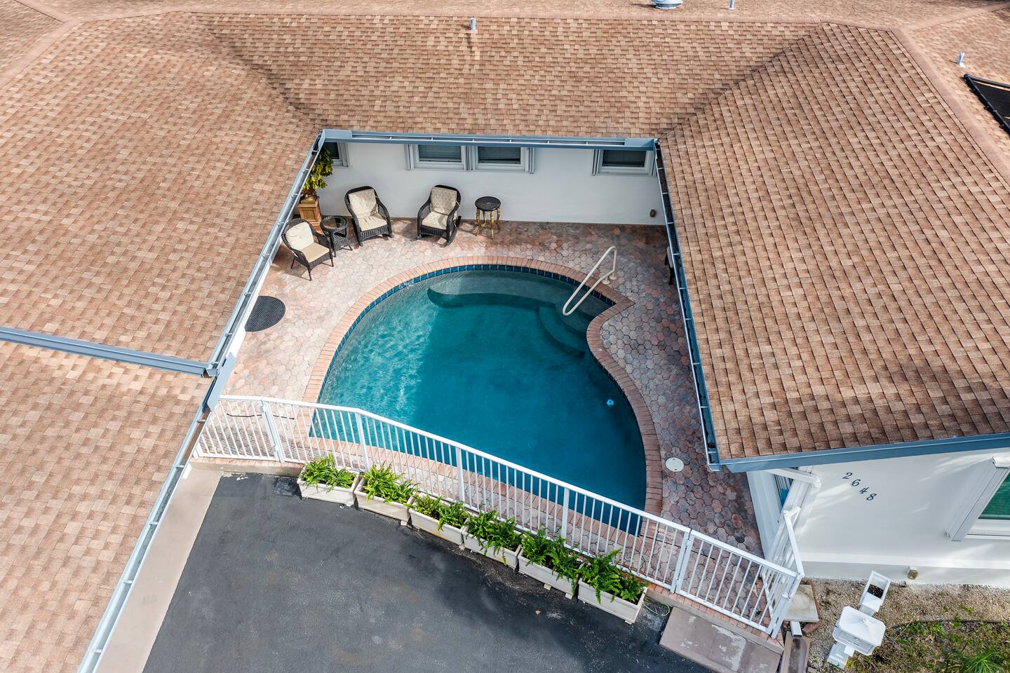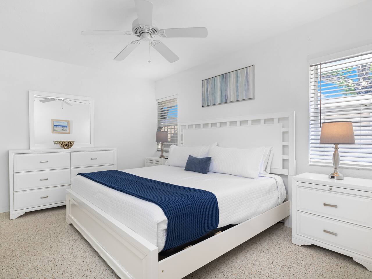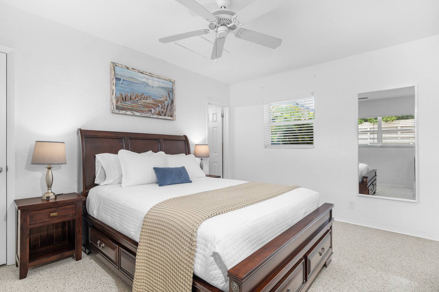 This spacious 2-bedroom, 2-bath duplex apartment features a shared pool situated between the two units. The unit is clean, updated, and includes a large living area with 70-inch smart TV, a fully equipped kitchen for preparing homemade meals, a dining area that seats four, and a private back patio. The bedrooms include a King and Queen bed, each with smart TVs and ample closet space. Conveniently located just 1.3 miles from the beach and within walking distance to Target, Publix, and the mall.