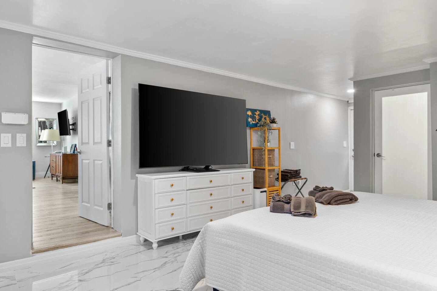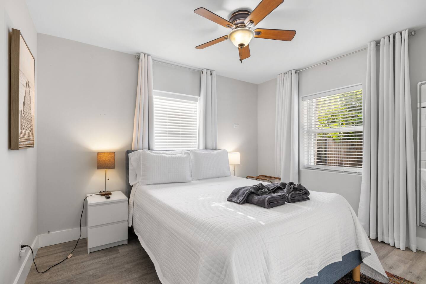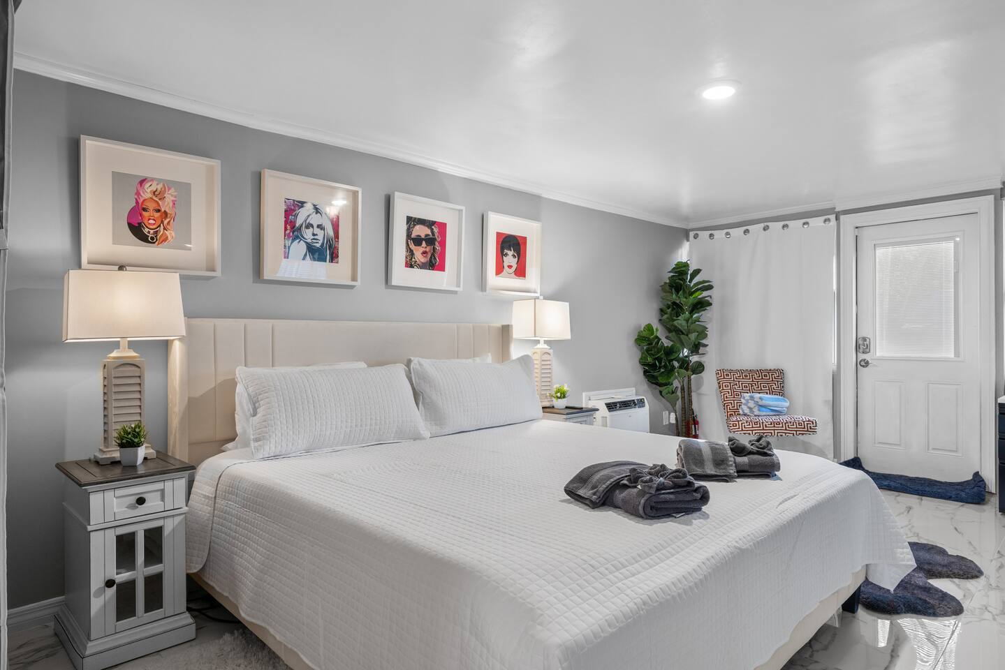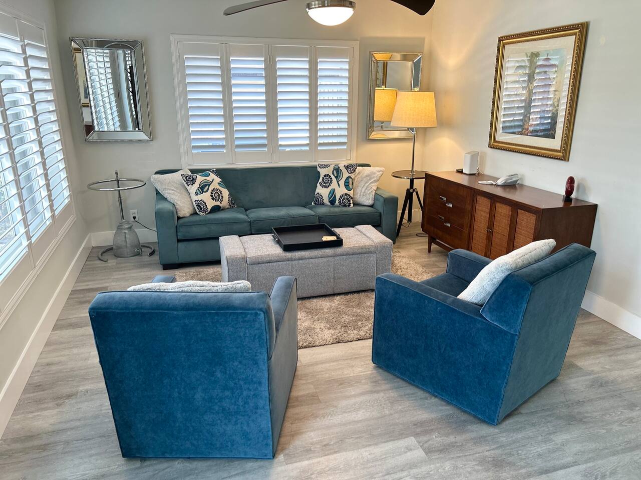 This single-family home offers a guests privacy and comfort. The home has 3 bedrooms, 2 bathrooms, a fully equipped kitchen, flat screen TVs, high speed internet, and a washer and dryer. There are two separate living areas with comfortable furniture and tasteful design. The backyard is the star of the show with large heated saltwater pool, outdoor shower, and several seating options to relax. Several outdoor seating areas and a Weber gas grill. Bedroom 1 - King bed, 70+ inch flat screen TV, En-Suite bathroom, desk/work area Bedroom 2 - Queen bed, flat screen TV Bedroom 3 - Queen bed, flat screen TV Living areas - two separate seating areas, one up front by open to the kitchen and the other in the back overlooking the pool. Laundry - FREE stackable washer/dryer Babies - Pack & Play + Highchair on premises Parking - Single driveway. To accommodate two vehicles, the cars must be stacked. Pool - Saltwater, heated to 86 degrees