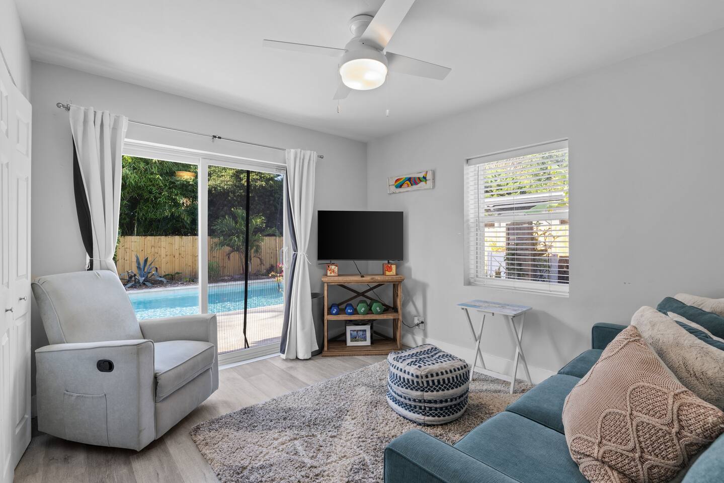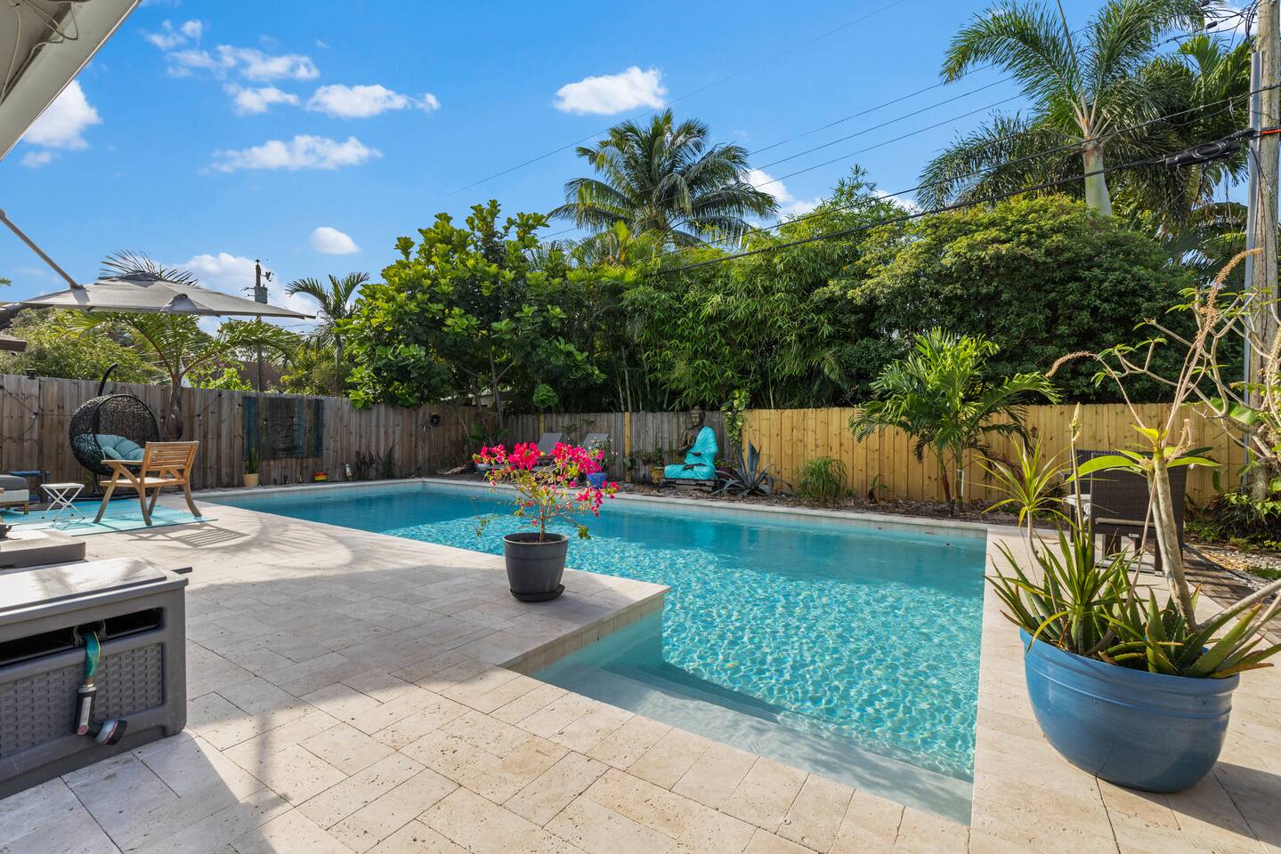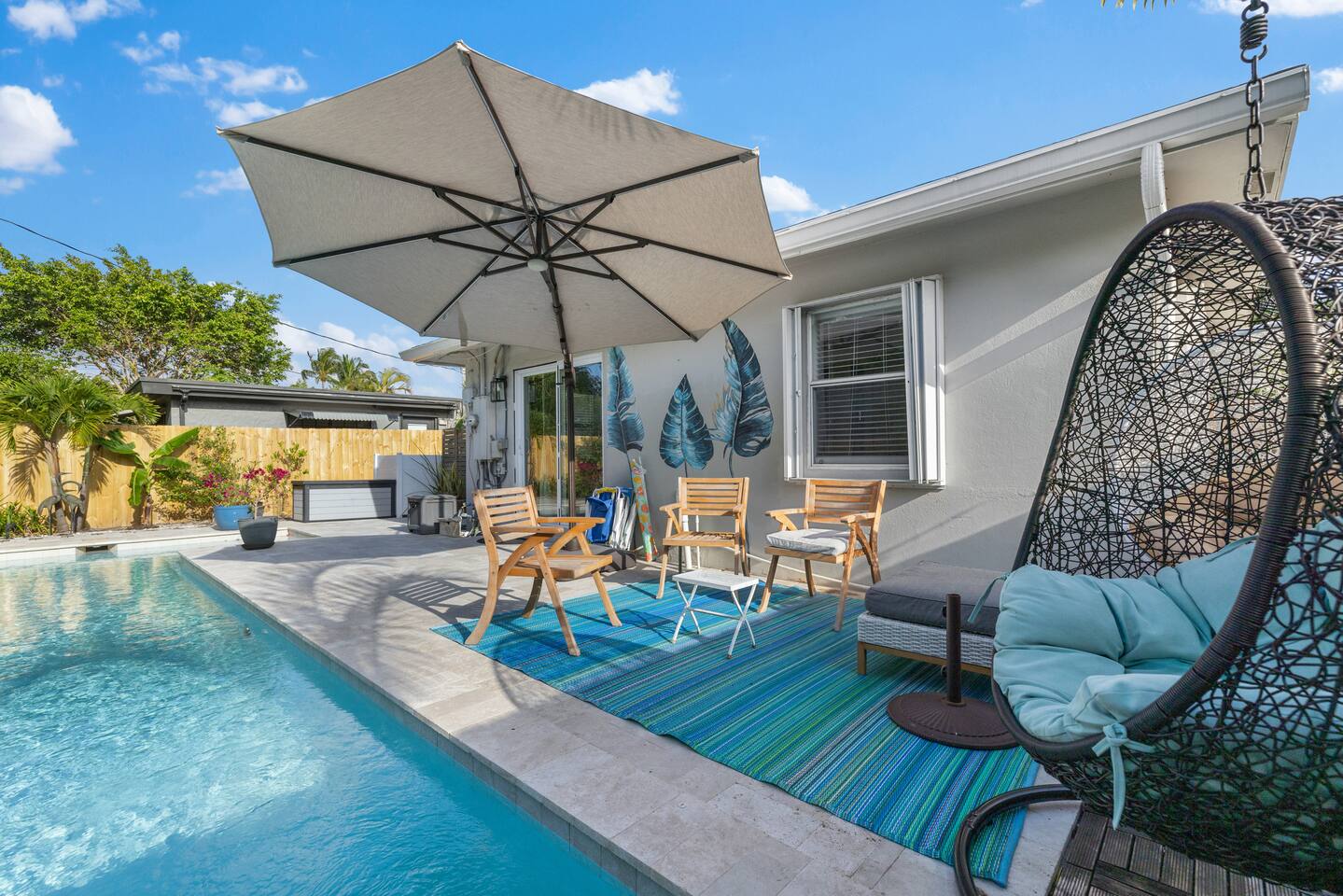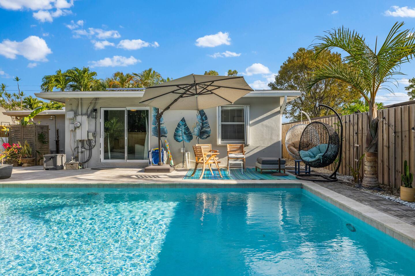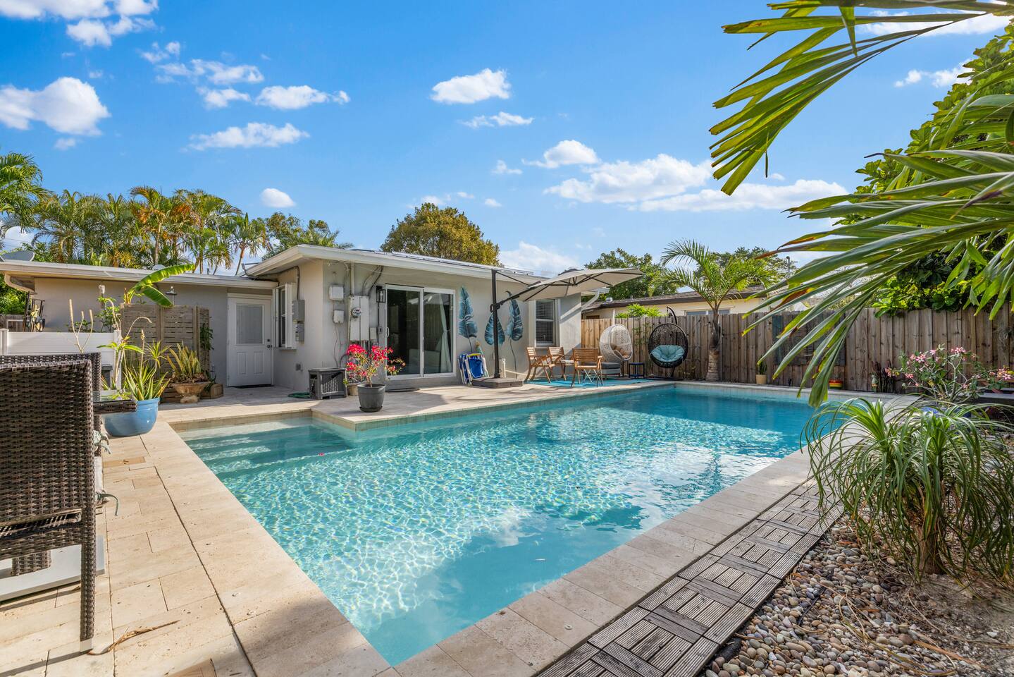Escape to paradise in this stunning 3-bedroom, 2-bathroom oasis. Perfectly designed for relaxation and rejuvenation, our home offers all the comforts you need for an unforgettable getaway. Venture outside to discover your own private slice of paradise. Our backyard oasis boasts a sparkling pool surrounded by lush palm trees and vibrant tropical foliage. Take a refreshing dip in the crystal-clear waters or soak up the sun on one of the lounge chairs as you sip on a cool beverage.